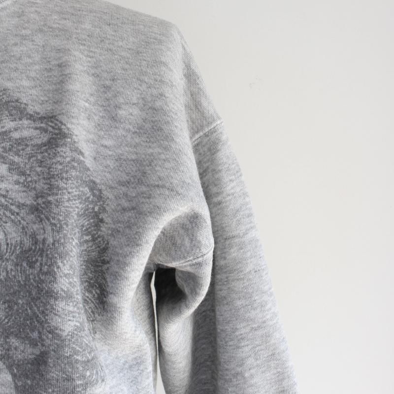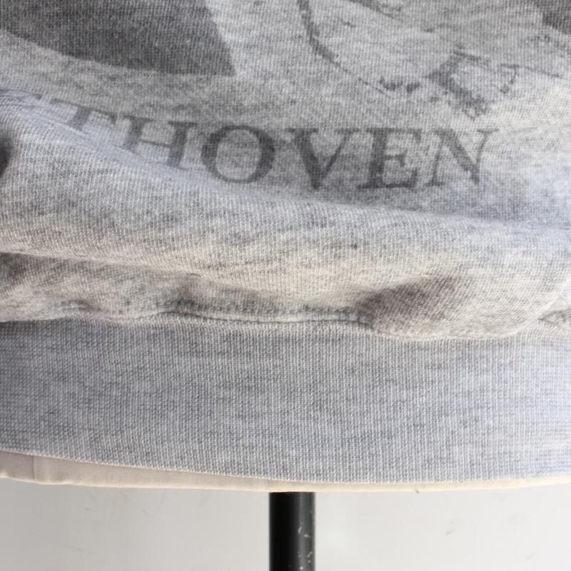 ベートーヴェンの肖像を大きく全面にプリントし、圧倒的なサイズ感と存在感が個性を放つスウェットです。60年代のヴィンテージアイテムをサンプリングして作られており、プリントはボディに深く馴染む染み込み仕上げで施され、スウェットにプリントされた際の歪みまで再現されている完成度の高さが特徴です。アメリカやメキシコ製の古いボディを厳選して使用しているため、色合い、サイズ感、風合いが異なる全て一点物。古着ならではの風合いと相まって着用するほどに表情が増し、本格的なヴィンテージの着心地と雰囲気を楽しんで頂けます。