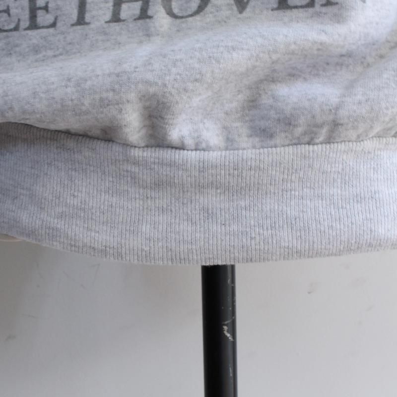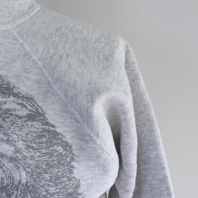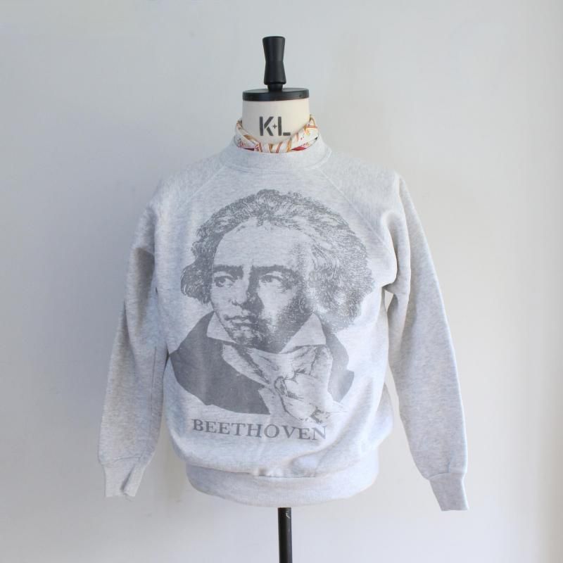 ベートーヴェンの肖像を大きく全面にプリントし、圧倒的なサイズ感と存在感が個性を放つスウェットです。60年代のヴィンテージアイテムをサンプリングして作られており、プリントはボディに深く馴染む染み込み仕上げで施され、スウェットにプリントされた際の歪みまで再現されている完成度の高さが特徴です。アメリカやメキシコ製の古いボディを厳選して使用しているため、色合い、サイズ感、風合いが異なる全て一点物。古着ならではの風合いと相まって着用するほどに表情が増し、本格的なヴィンテージの着心地と雰囲気を楽しんで頂けます。